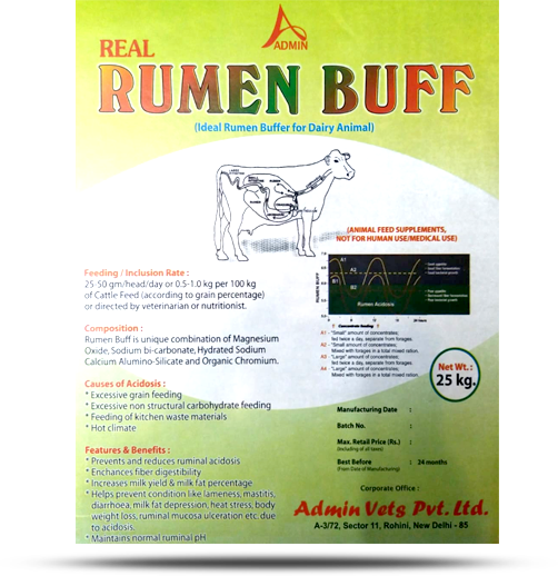 Rumen Buff is unique combination of Magnesium Oxide , Sodium bi- carbonate, Hydrate sodium Calcium Alumino- Silicate and Organic Chromium.